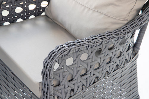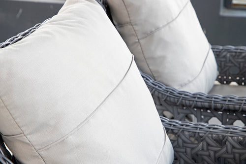 Het materiaal van de tafel, banken en stoelen is aluminium met daaroverheen en rattan geweven design. De kussens zijn waterproof en zijn daarom makkelijk te reinigen.