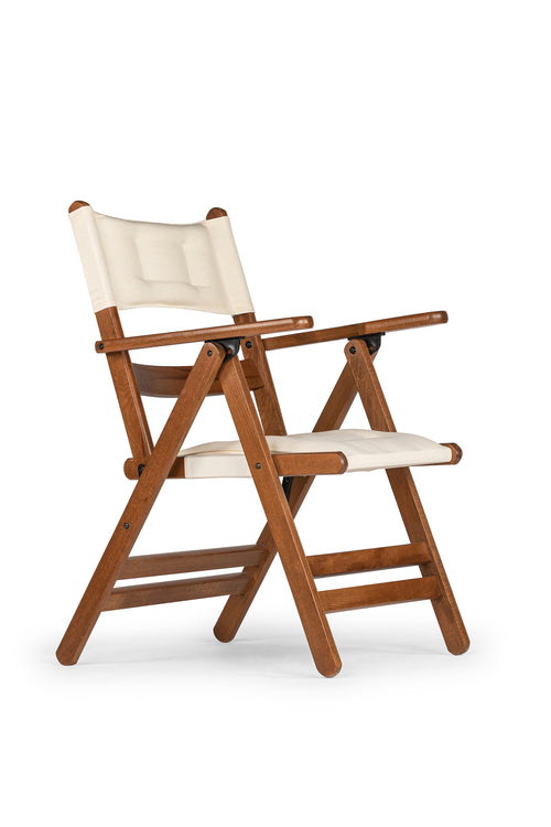 Combinatieset van een opvouwbare Mirani tafel en vier opvouwbare Mirani stoelen van haagbeukenhout met zitkussens. Waterbestendige laklaag.